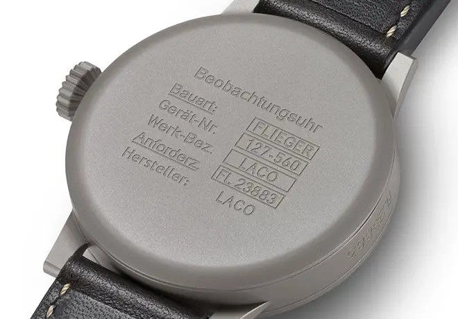 La Laco Friedrichshafen s’inscrit directement dans cette tradition. Elle reprend fidèlement les caractéristiques des montres d’époque, notamment le cadran Baumuster B, reconnaissable à son affichage central des minutes et à son cercle extérieur gradué pour les secondes. Ce type de cadran permet une lecture rapide et intuitive, essentielle en navigation aérienne.