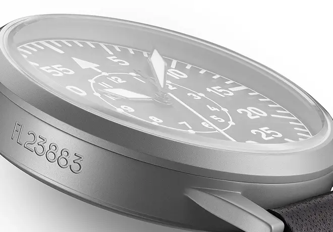 Son cadran Baumuster B constitue l’élément central de son identité. Il est conçu pour offrir une lecture immédiate des minutes, essentielles en navigation aérienne, avec des index et aiguilles recouverts de Super-LumiNova pour une visibilité optimale dans l’obscurité. Le verre saphir bombé, traité anti-reflets, renforce cette lisibilité tout en protégeant efficacement le cadran.