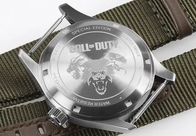Le design reste fidèle aux codes Khaki Field : cadran noir lisible, aiguilles luminescentes et construction robuste. Mais des éléments distinctifs viennent renforcer son identité, notamment le fond de boîte gravé du logo Call of Duty et un packaging exclusif inspiré de l’univers du jeu.