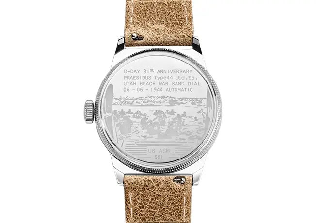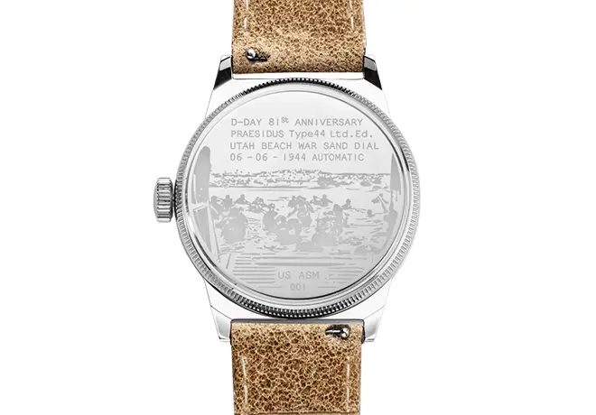Le choix du bleu « Higgins » renforce cette identité, en référence aux barges de débarquement utilisées lors de l’opération Overlord. Ce détail, combiné au sable, inscrit la montre dans une narration historique cohérente et immersive. La Praesidus A-11 UB Higgins Blue devient ainsi bien plus qu’une montre : un objet de mémoire, à la croisée de l’histoire, du design et de l’horlogerie.