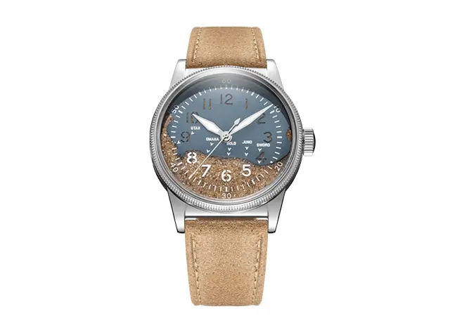 Le cadran « Higgins Blue » constitue le cœur du projet. Il est conçu à partir de véritable sable prélevé sur Utah Beach, l’un des sites majeurs du Débarquement de 1944. Ce choix donne à la montre une dimension presque patrimoniale, transformant un garde-temps en objet chargé de sens.